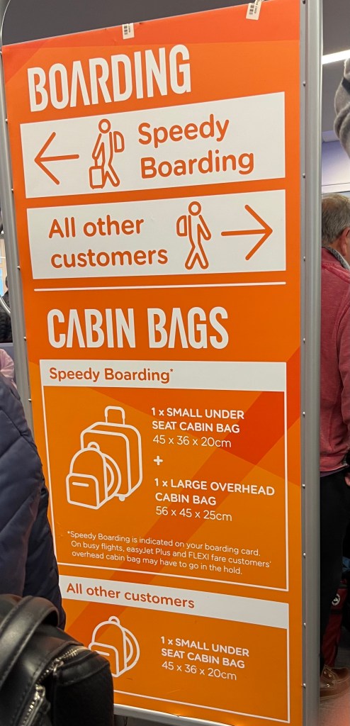 It also turned out, if you’d paid £15 for ‘Speedy Boarding’ beforehand, you could take on a normal bag. If you paid this £24 now, you did not get the speedy boarding. Or your bag on the flight. It’s unclear what, exactly, you did get, except frustration and public shaming.