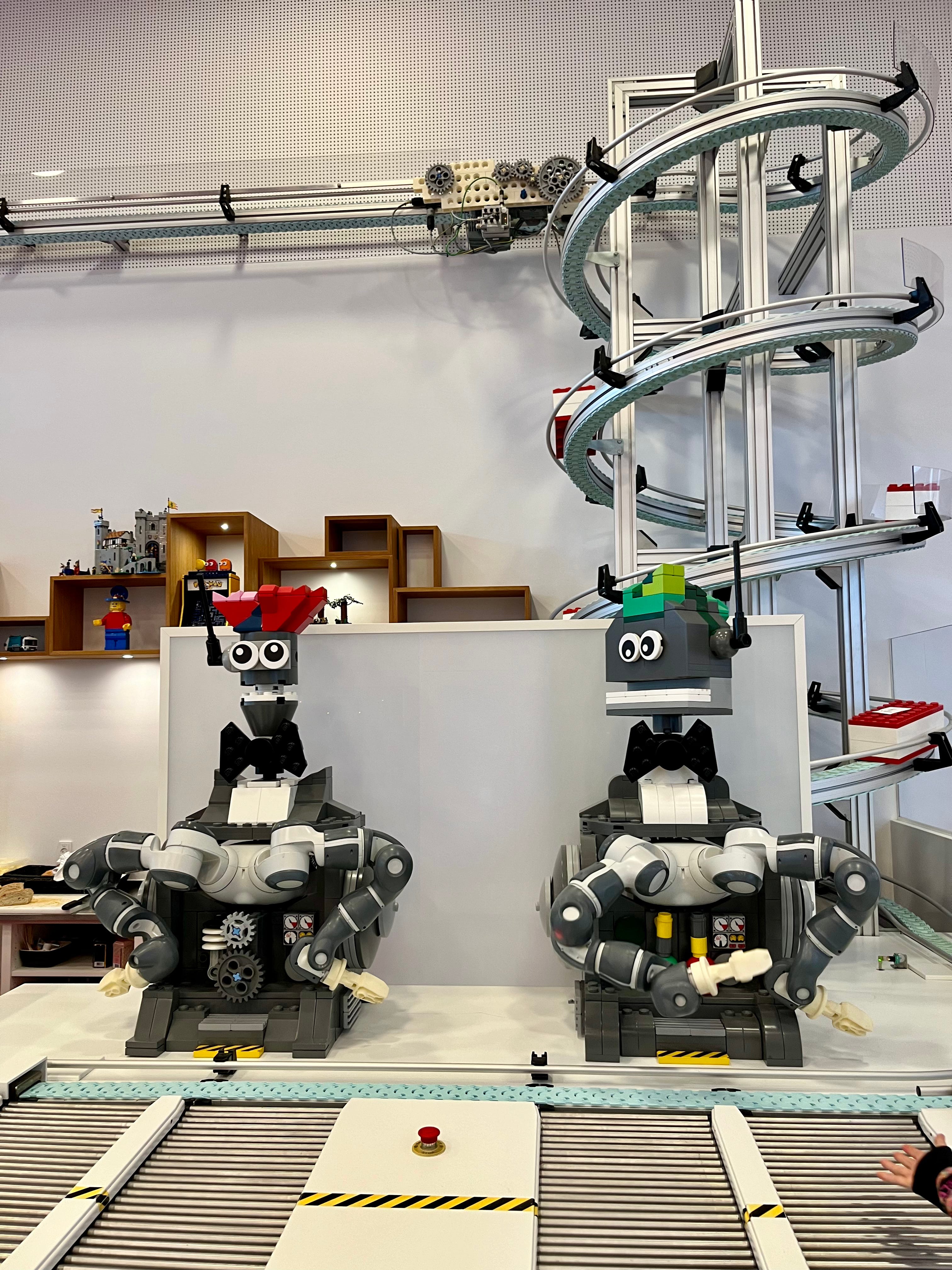 A few minutes later, the screen lights up, and you’re told to collect your food from the friendly robots. You see your box (a large Lego brick, of course) making its way along the chute and down a conveyor belt. It arrives in front of one of the robots, who looks at it, looks at you, and gently push it towards you.