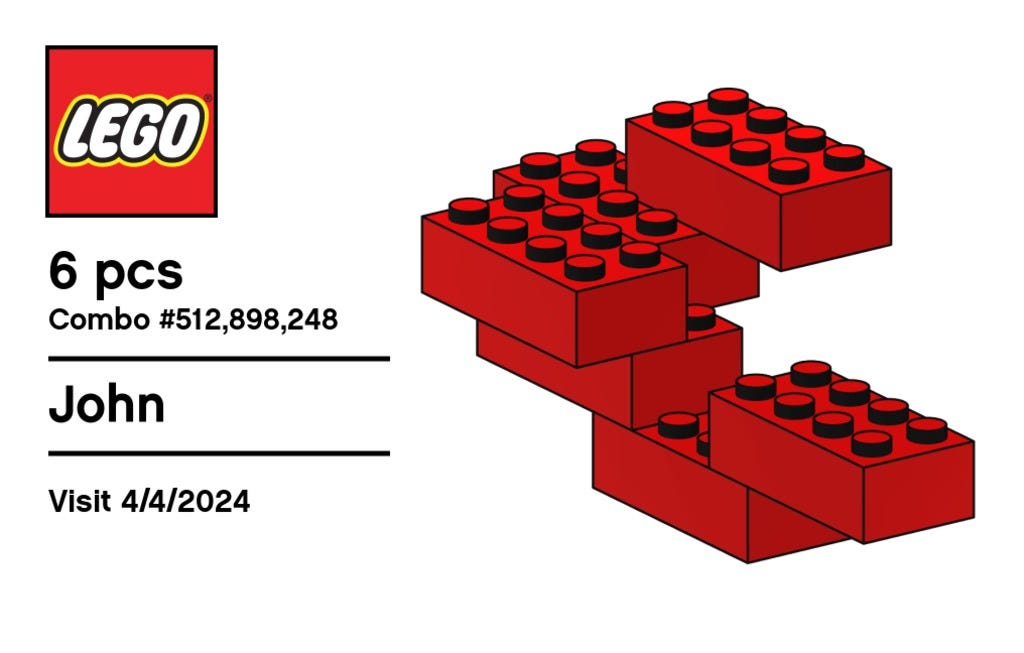 It turns out, there are 935 million possible combinations of six red Lego bricks. Who knew! And every visitor to Lego House, well, they get their own one. You scan your wristband, it thinks for a bit, and ta-dah! You get your own, unique 6-brick combination. Your name gets flashed up on the screen, a card gets printed with your name and combo, and behind you, a machine churns out packets of six red bricks for you to take and make with.