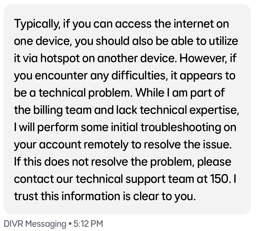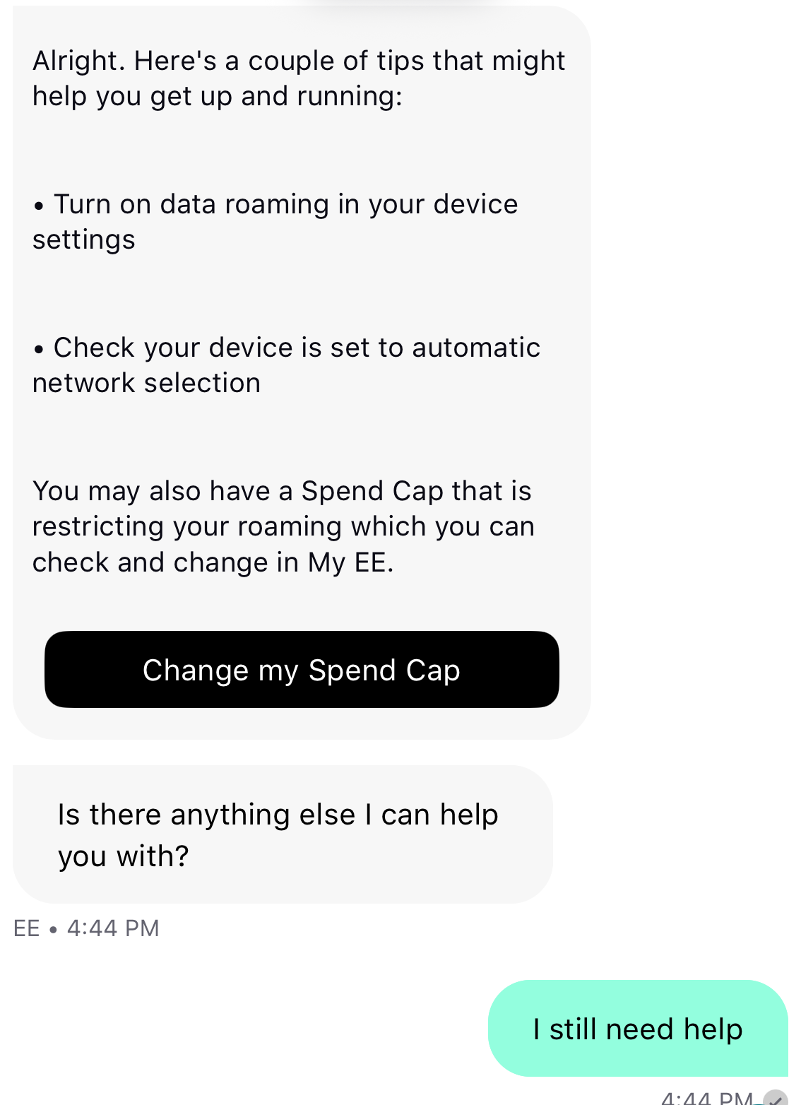 But the eagle eyed amongst you will spot something here. That Chatbot I spoke to right at the start? Well, it did actually suggest the spend cap solution to my problem. But the explanation wasn’t clear as to why that might be the solution, suggesting that ‘you may have a spend cap that is affecting your roaming’, whereas the actual problem was that I didn’t have one at all. And because I knew I didn’t have one, I discounted that as a possible option.