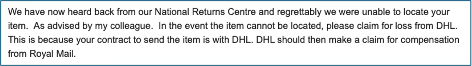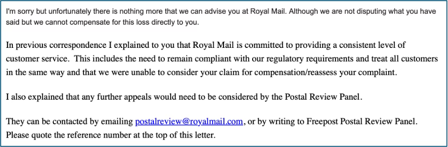 Eventually, the promised Royal Mail investigation reply appeared in my inbox…