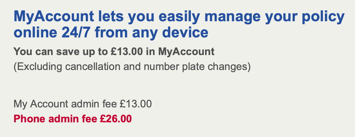 (Some companies have tried to frame this as a benefit, a saving if you go online. There’s a logic to that – online, less people, lower cost. Very logical, very rational. But seeing a ‘phone admin fee’ of £26 doesn’t talk to the logical part of my brain; rather, it makes me think if I need you in a hurry, you’re not going to be there for me)